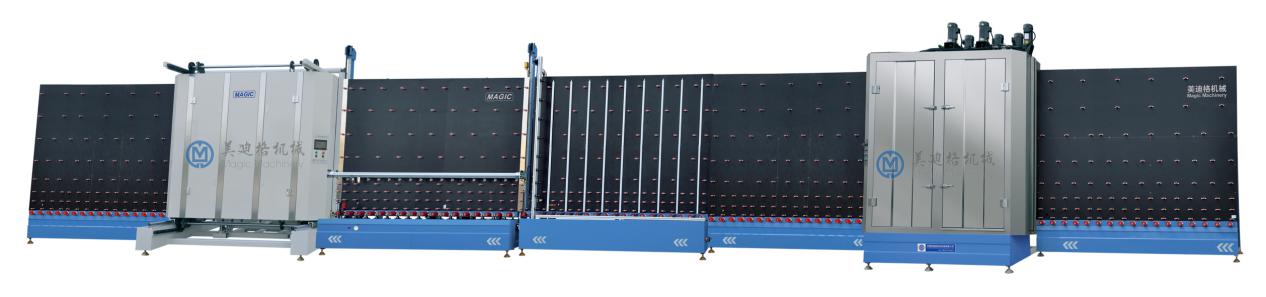 (2)立式中空玻璃設(shè)備分為立式中空玻璃平壓生產(chǎn)線(xiàn)和立式中空玻璃輥壓生產(chǎn)線(xiàn),立式輥壓設(shè)備逐漸被市場(chǎng)淘汰不再重點(diǎn)介紹。立式平壓中空玻璃設(shè)備主要包括由進(jìn)料段、清洗干燥段、燈檢段、定位檢查段、合片段、輸出段六部分組成。其優(yōu)點(diǎn)是自動(dòng)化成度高,工作效率高。但對(duì)廠(chǎng)房長(zhǎng)度尺寸有要求。